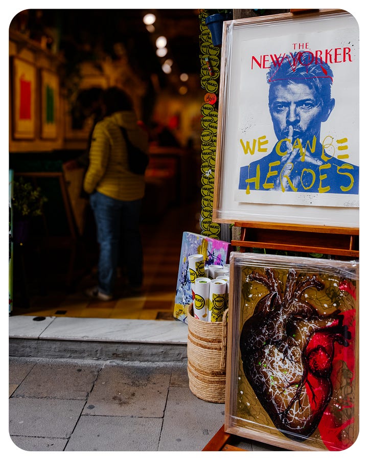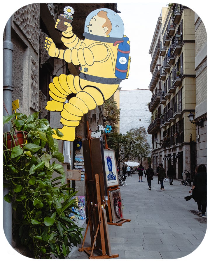 Walk down the Gothic quarters to the old town, and the sights of street musicians change to those of small-time art galleries. If not for the Tintin memorabilia hanging at the front door of the store, I would stop for some Bowie, any time of the day.