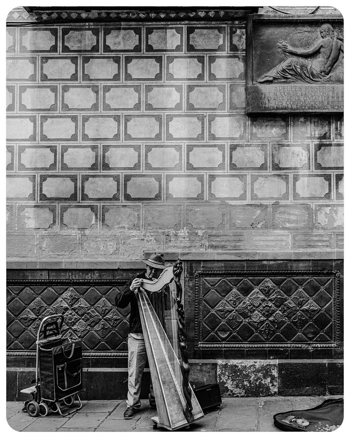 Ask the street musician playing Harp, he might have some verses.